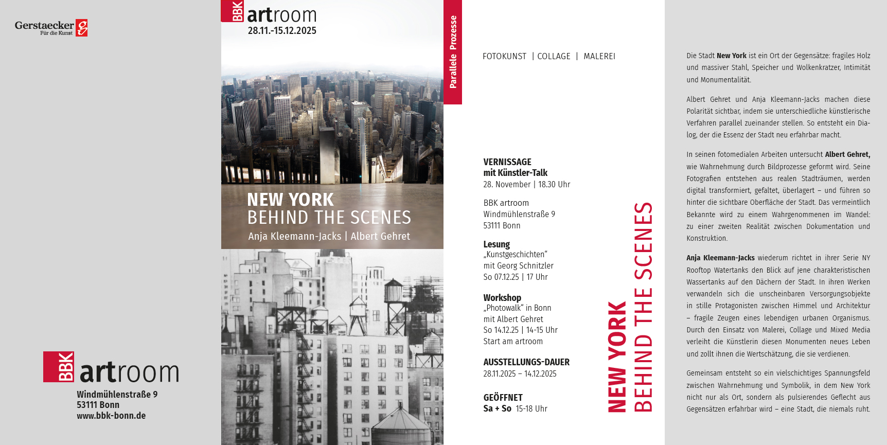 Albert Gehret und Anja Kleemann-Jacks machen diese Polarität sichtbar, indem sie unterschiedliche künstlerische Verfahren parallel zueinander stellen. So entsteht ein Dialog, der die Essenz der Stadt neu erfahrbar macht.